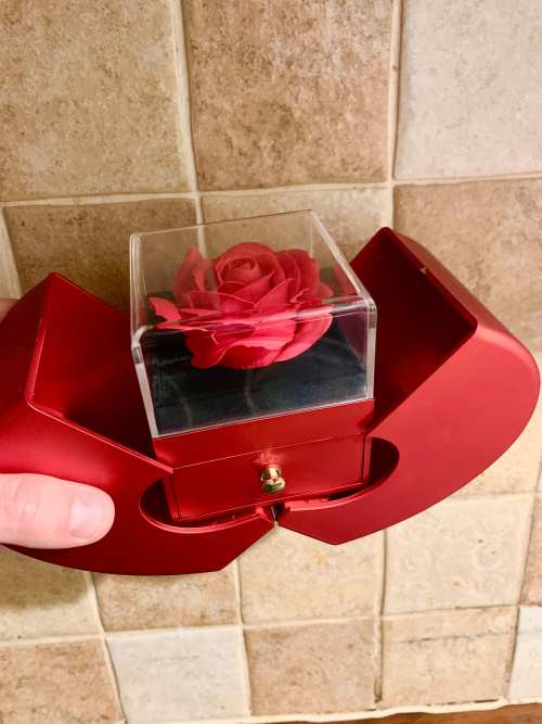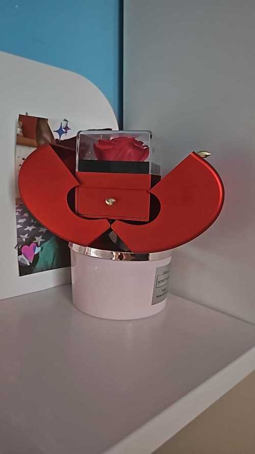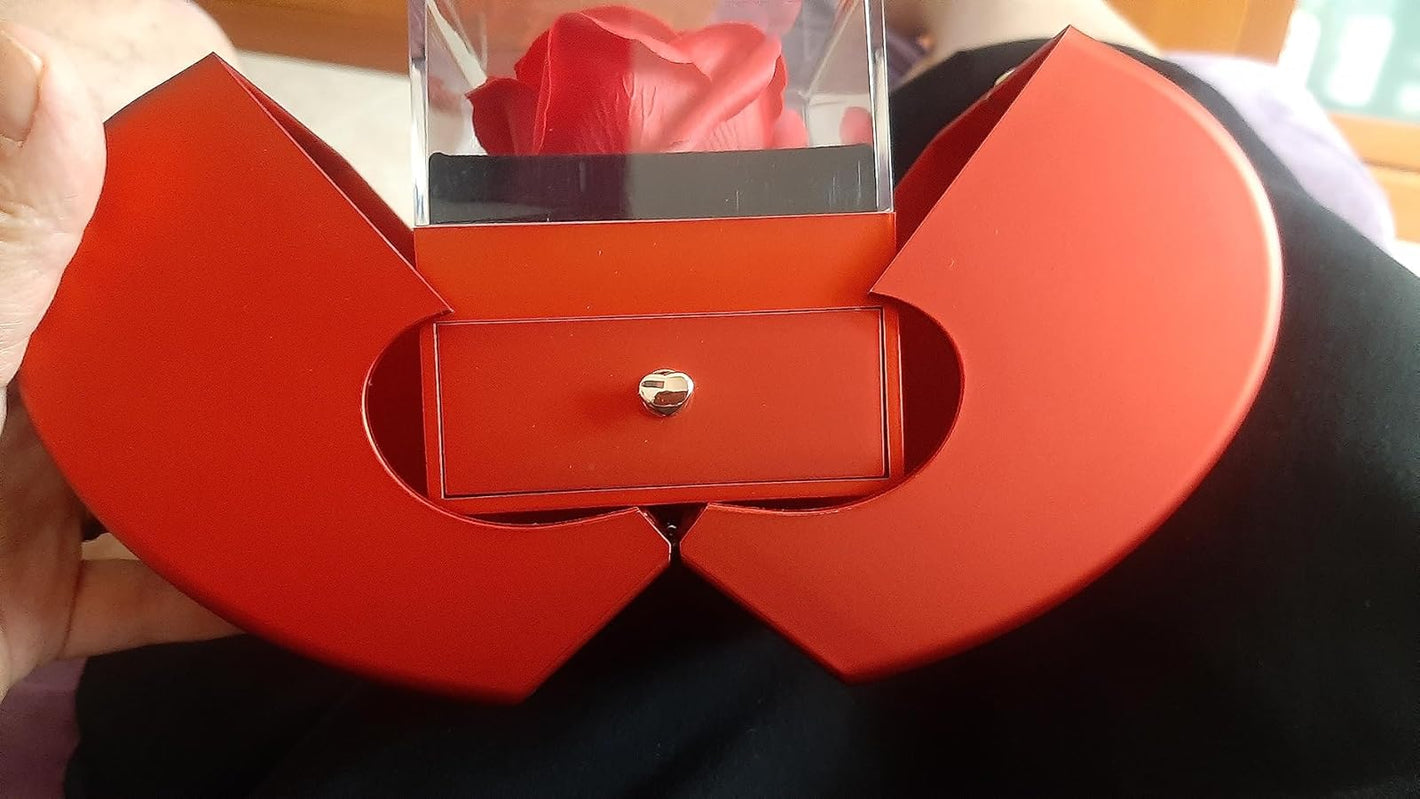 El cofre de rosas tiene un diseño innovador en forma de manzana, con un pequeño cajón oculto ideal para almacenar joyas, como anillos o collares. Perfecto para sorprender y decorar cualquier espacio.